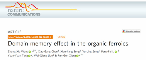近日,《Nature Communications》在线刊发我校化学化工学院王仲夏教授最新研究成果“Domain memory effect in the organic ferroics”(Nat. Commun., 2022, 13, 2379),详细介绍了首例具有光、热多通道控制可擦写铁电畴和铁弹性畴的单组分有机对映体多铁晶体,其在可逆相变后表现出独特的铁性畴记忆效应。该工作得到国家自然科学基金,赣南师范大学专项启动经费等项目资助,也得到南昌大学分子铁电化学江西省重点实验室的支持,王仲夏为第一作者和通讯作者,赣南师范大学为论文第一完成单位。