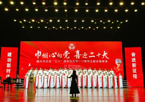 3月8日,赣州市庆祝“三八”国际妇女节112周年表彰大会暨“巾帼心向党 喜迎二十大”主题合唱展演在赣州大剧院举行,我校合唱团80名师生受邀参演,校党委副书记胡龙华出席活动。