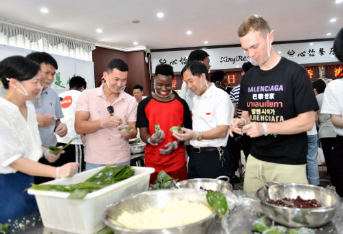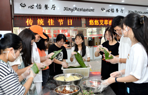 国际教育学院教师用中英文介绍端午节的起源和习俗后,在场领导、老师以及中外学生在餐厅员工的指导下学习包粽子,体验劳动的乐趣。现场欢声不断,充满着节日的喜悦氛围。