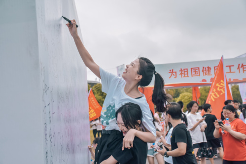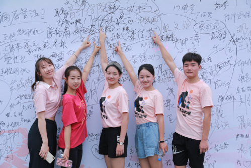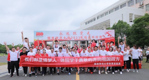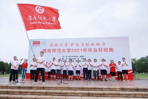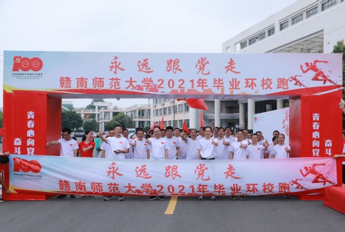 随着发令枪响,由领导老师和2021届优秀毕业生代表组成的领跑团首先出发,各教学学院师生方队依次起跑,经过一教楼、“精气神”石刻、“蓝色海洋”运动场、明湖等校园里最熟悉的场景,一同重温在赣师校园的生动记忆。奔跑结束,同学们纷纷与学校领导、老师合影留念,并在留言板上写下了对母校的眷恋、祝福以及“青春心向党,奋斗新征程”的毕业寄语。