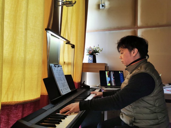 针对实践类课程线上教学难点,音乐学院组织教师积极探索音乐学、舞蹈学专业线上教学模式。该院杜华龙老师用两个手机、电脑和写字板、电钢琴结合的教学手段,利用固定物从高往下拍摄,调整高低两个角度并固定,实现了钢琴键盘和谱面、弹奏曲目和分析谱面时的完美切换。电脑和手机同时登录,实现乐谱、图片、音频资料的快捷分享,并将有关软件安装到电脑,通过音响传播获得很好的教学效果。杜华龙将经验以视频和书面材料形式在教师群分享,在学院得到有效推广。