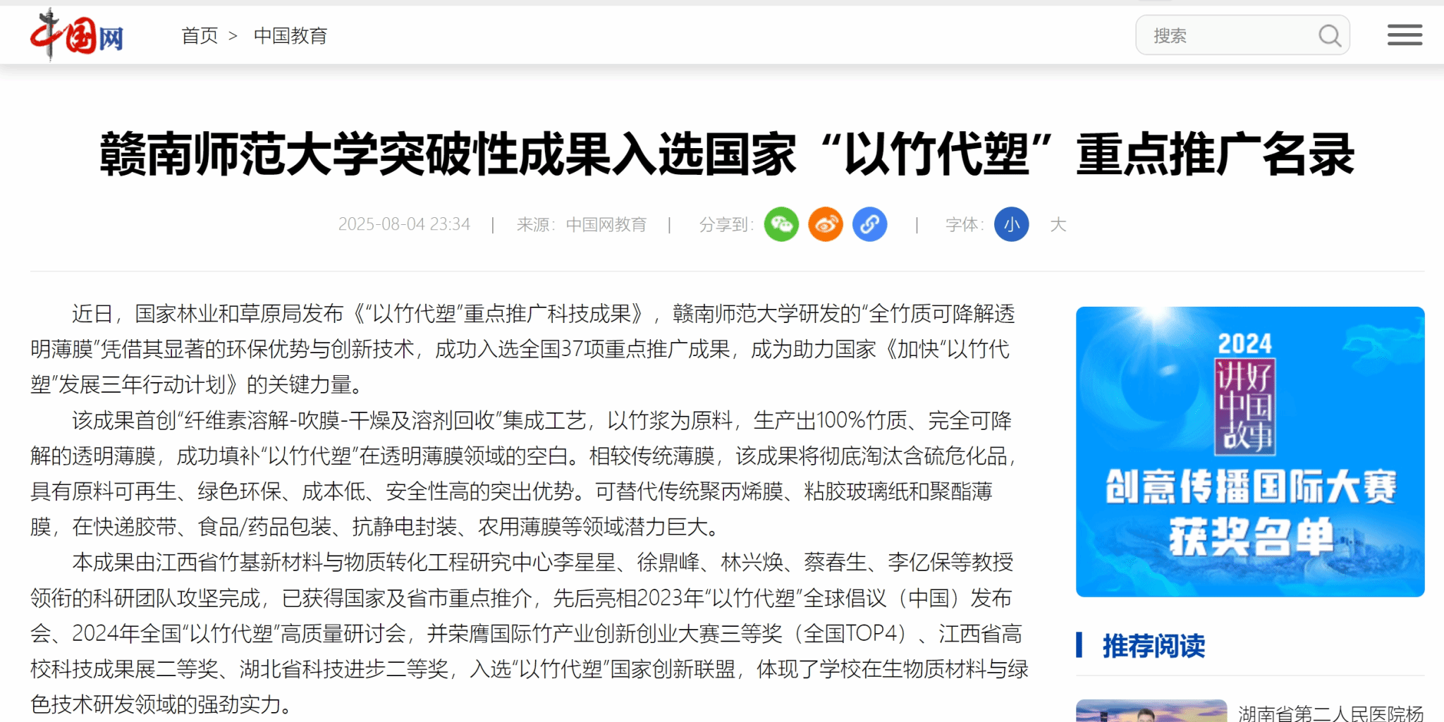 上一条:【学习强国】赣南师范大学突破性成果入选国家“以竹代塑”重点推广名录