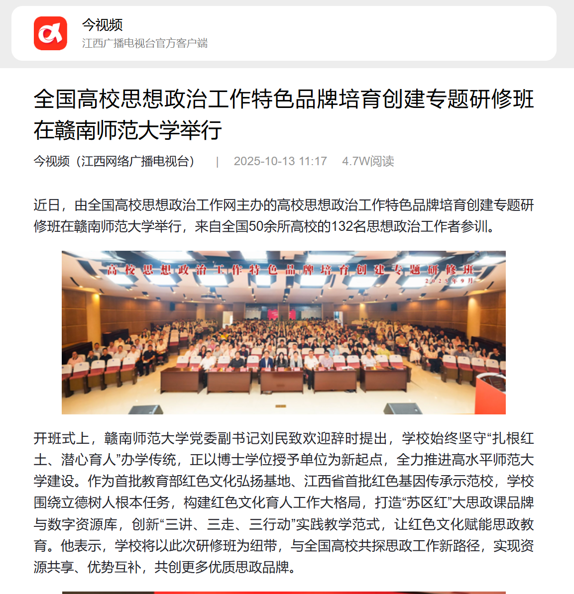 下一条:【中国网】全国高校思想政治工作特色品牌培育创建专题研修班在赣南师范大学举行