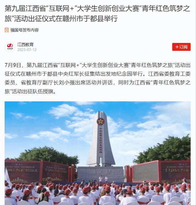 下一条:【学习强国】第九届江西省“互联网+”大学生创新创业大赛“青年红色筑梦之旅”出征仪式在赣州于都举行