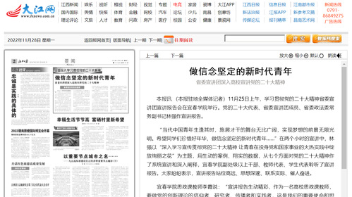 上一条:【江西新闻网】做信念坚定的新时代青年 省委宣讲团深入高校宣讲党的二十大精神