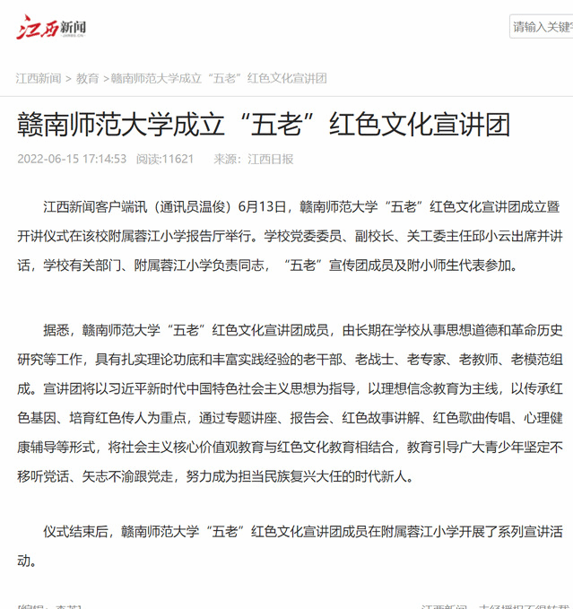 上一条:【学习强国】江西教育:赣南师范大学成立“五老”红色文化宣讲团