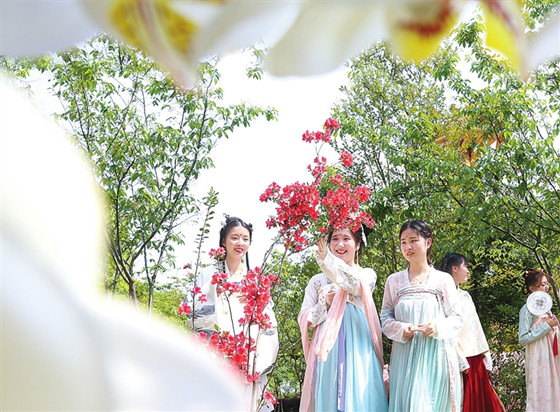 3月31日,几名身穿汉服的女大学生在赣州五龙客家风情园内游园、赏花。当天是农历二月十五,是民族传统节日中与中秋节对应的花朝节,俗称“花神节”“百花生日”。