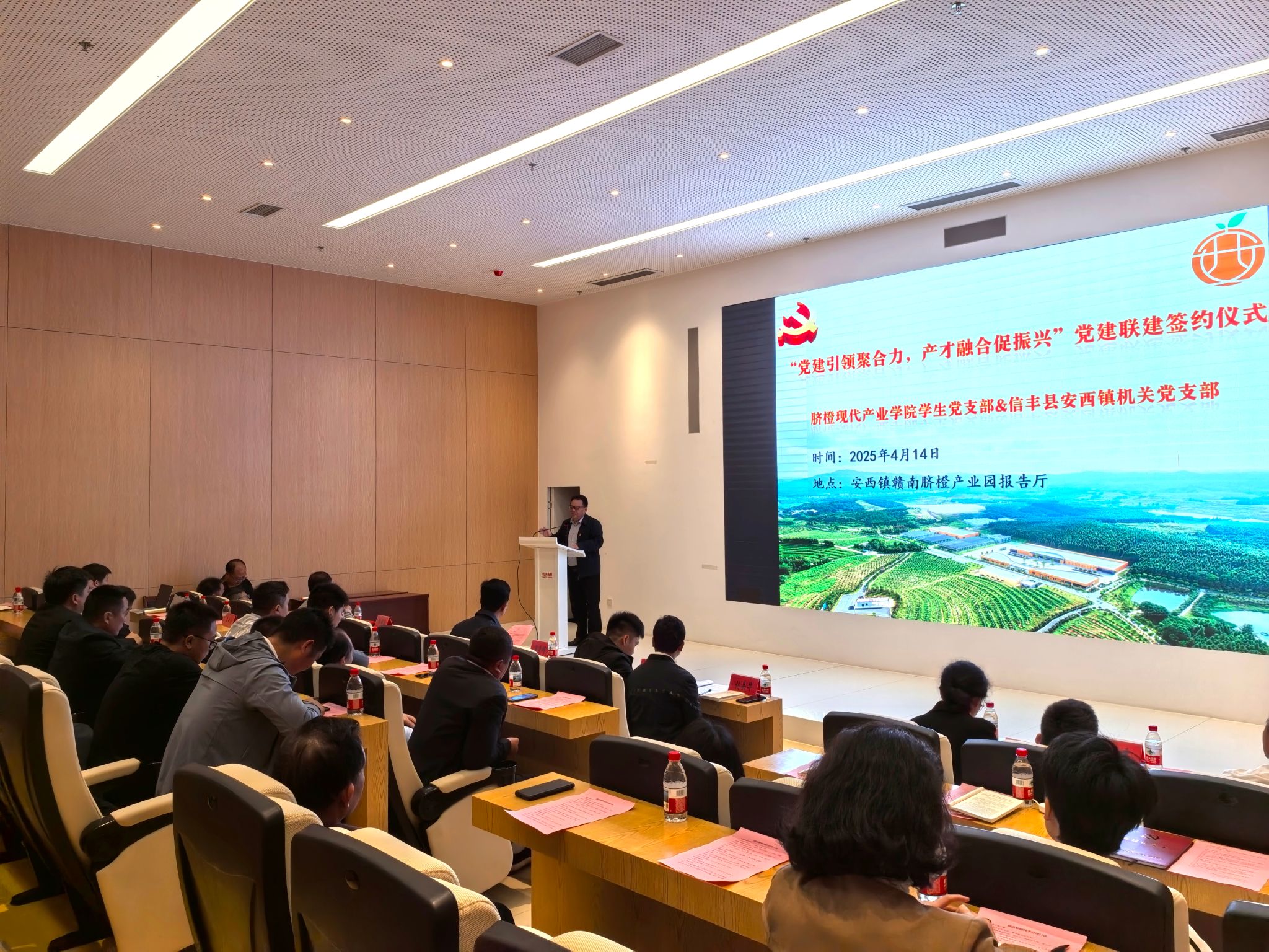 4 月 14 日上午,脐橙现代产业学院与信丰县安西镇携手开展 “党建引领聚合力,产才融合促振兴” 活动。脐橙现代产业学院、安西镇党委负责同志,脐橙现代产业学院师生党员代表,安西镇、发控集团有关工作人员以及果农代表共同参与了此次活动。