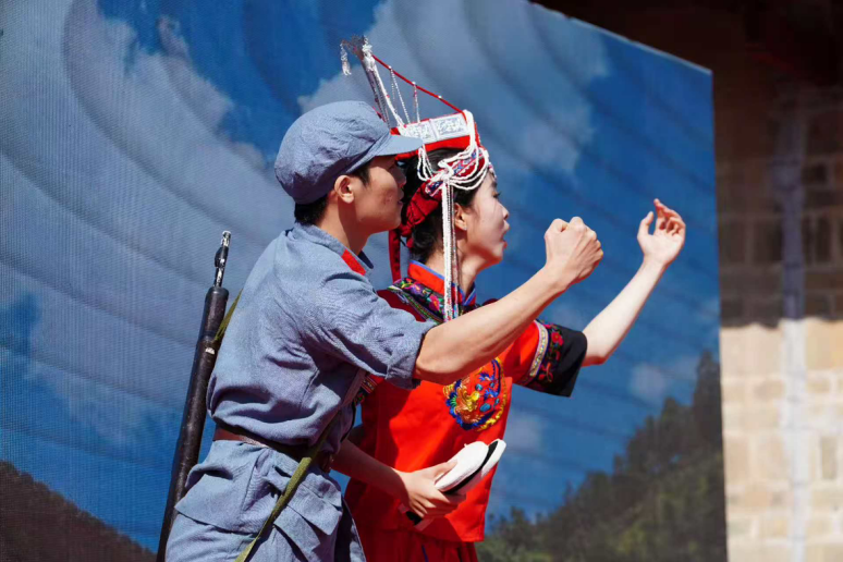 活动当日,正值上犹县脐橙丰收季节,现场人头攒动,气氛热烈。学子们倾情演绎的红色文旅剧《三双布鞋》,以赣南苏区革命历史为背景,生动再现了苏区群众赶制布鞋支援前线、红军战士珍视军民情谊奋勇杀敌的感人场景,深刻诠释了“军爱民、民拥军”的鱼水深情,真挚的表演深深打动了现场每一位观众。
