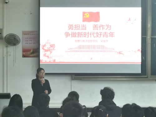 3月18日,物理与电子信息学院团委在六教121教室举办2023001期“周末业余团校”。学院党委副书记吴俊萍以《勇担当,善作为,争做时代好青年》为题为学院团委、学生会全体成员授课。