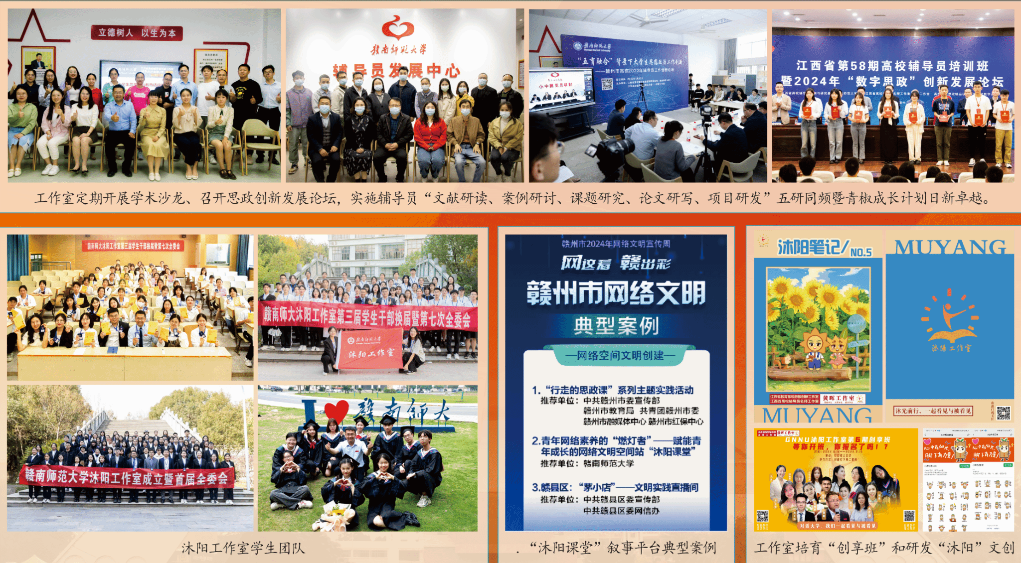 他首创“五研驱动”培养法:联合省内外9所高校,共同实施“文献研读、案例研讨、课题研究、论文研写、项目研发”辅导员“青椒成长计划”。该计划培养的辅导员中,有4人次荣获全国高校辅导员年度人物提名奖(入围)、8人次获江西省高校最美辅导员。他推进“卓越辅导员日新成长计划”,组织日新讲堂(辅导员沙龙)34期,卓越辅导员成长论坛4期,全省辅导员素质能力提升工作坊6期,开展卓越辅导员成长“慧”2期,成功孵化市级以上名师工作室6个。